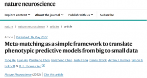 研究者通过对先前的小样本数据分析发现,个体的认知、心理健康、人口统计学和其他健康属性等表征特性与大脑成像数据之间存在一种内在的相关性。基于小样本数据和大数据集之间的这种相关性,研究者提出名为元匹配(meta-matching)的方法。这一方法可以将大数据集上训练出来的机器学习模型迁移到小数据集上,从而训练出更可靠的模型,以更准确地预测新的表型。