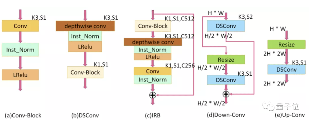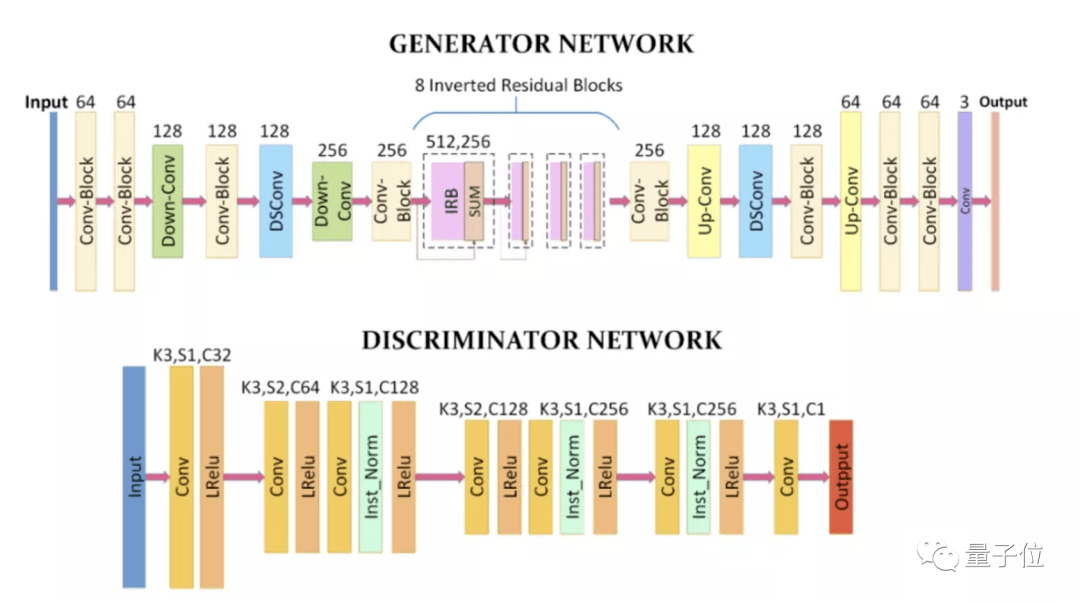 为了有效减少生成器的参数数量,AnimeGAN的网络中使用了8个连续且相同的IRB (inverted residual blocks)。