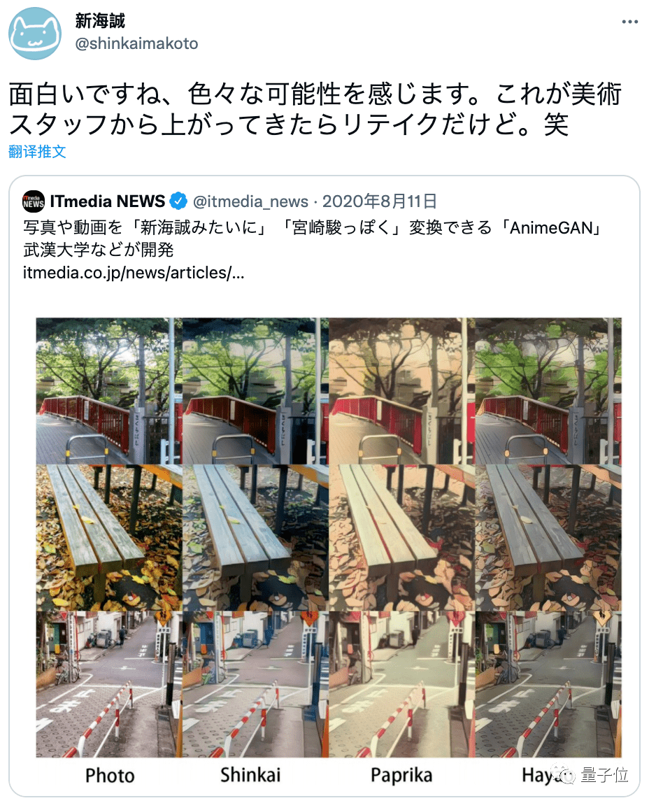 要知道,就连 新海诚导演都曾转发过AnimeGAN的作品呢。
