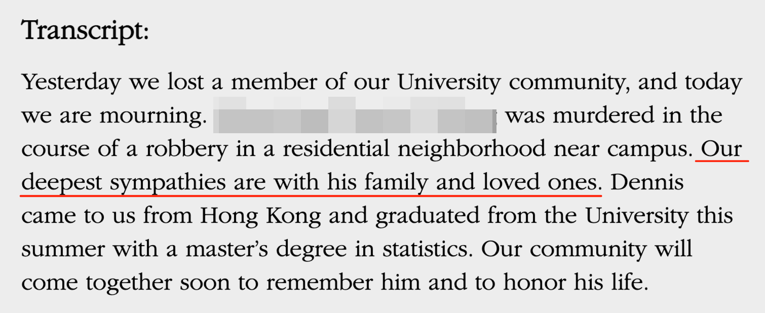 随后,芝加哥大学校长Paul Alivisatos对郑同学的不幸离世表示哀悼。