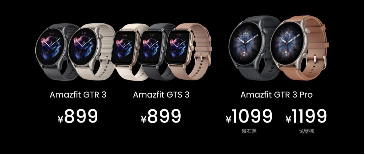 此次共发布了三款智能手表,Amazfit GTR 3 和 GTS 3以及GTR 3 Pro,售价在899元起。