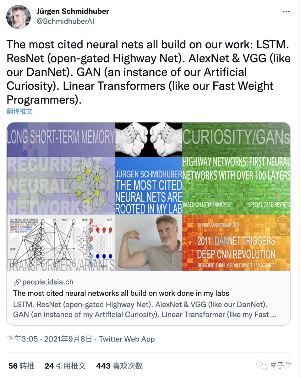 在这篇“直抒胸臆”的推文里,他还专门链出了个博客,里面历数了他和他的团队在LSTM、ResNet、AlexNet和VGG、GAN以及Transformer变体——这五个赫赫有名的神经网络上的早期贡献。
