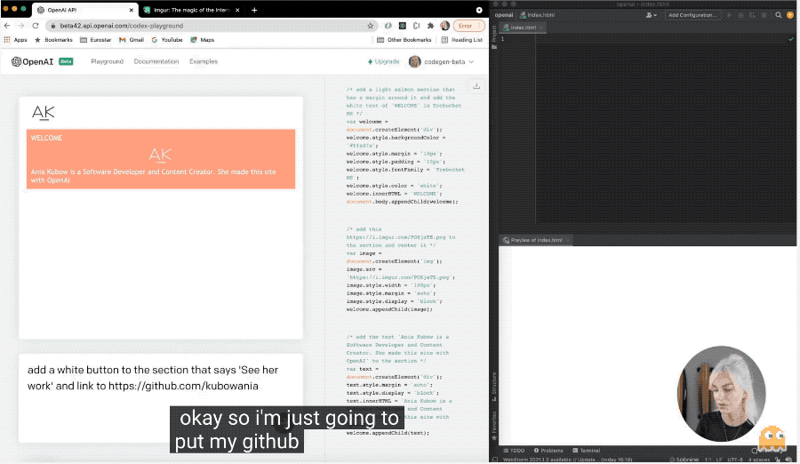 可以看出这里Codex是用Javascript操作Document对象来生成网页,可能是训练集里没有直接的HTML代码的缘故吧。
