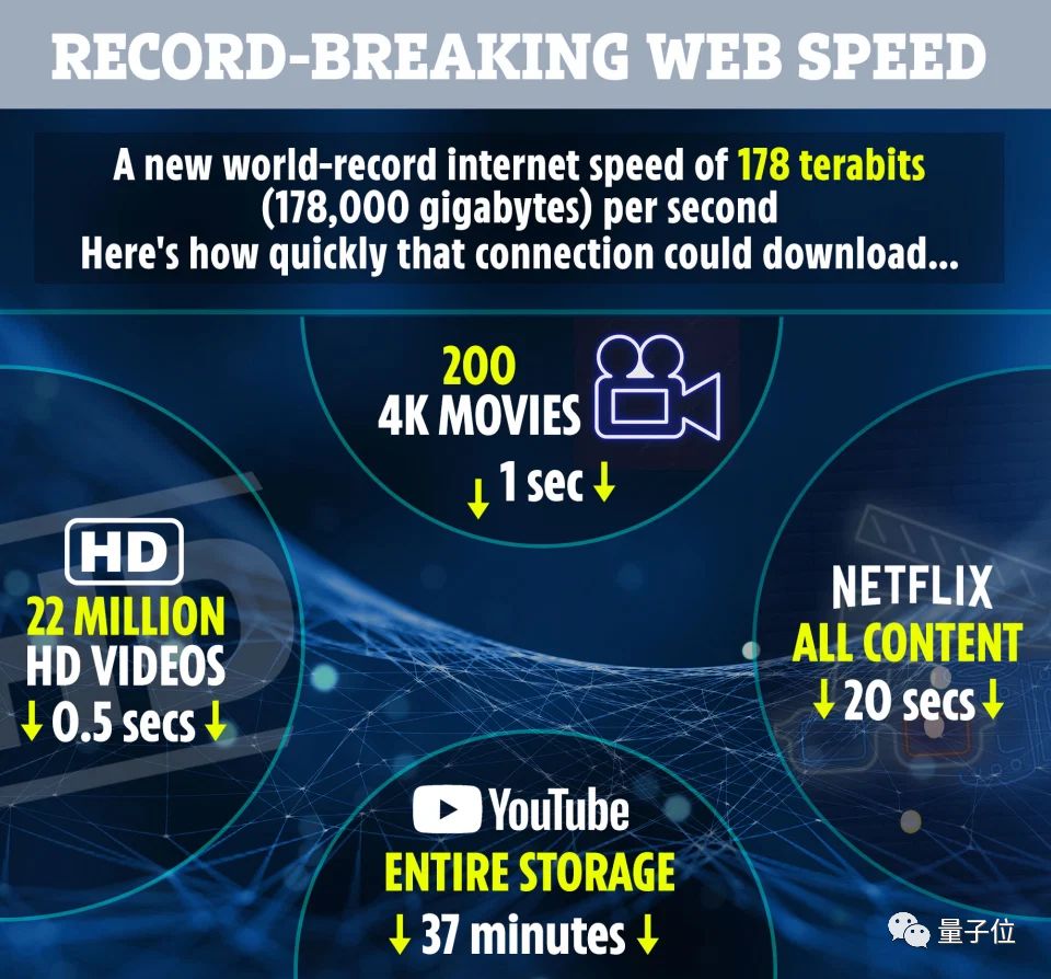 可以看到,光是178Tb/s的速度就可以1秒下载200部4K电影,20秒拿下整个Netflix的媒体库,以及37分钟“吞掉”YouTube上所有内容。
