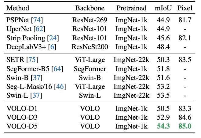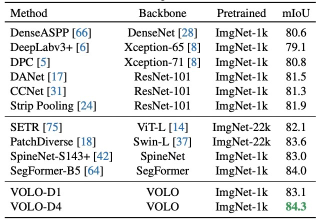 不仅如此,预训练好的VOLO模型还可以很好地迁移到下游任务,如语义分割:它在Cityscapes数据集上获得了84.3%的mIoU。