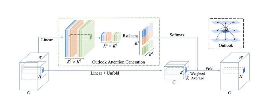 其中,通过reshape操作(绿框),可以从具有线性层的中心token简单生成大小为K×K的局部窗口的Outlook注意力矩阵。