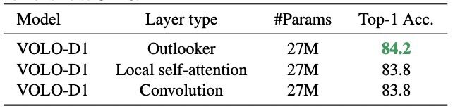 结果表明,在训练方法和架构相同的情况下,Outlooker都优于局部自注意力和空间卷积。
