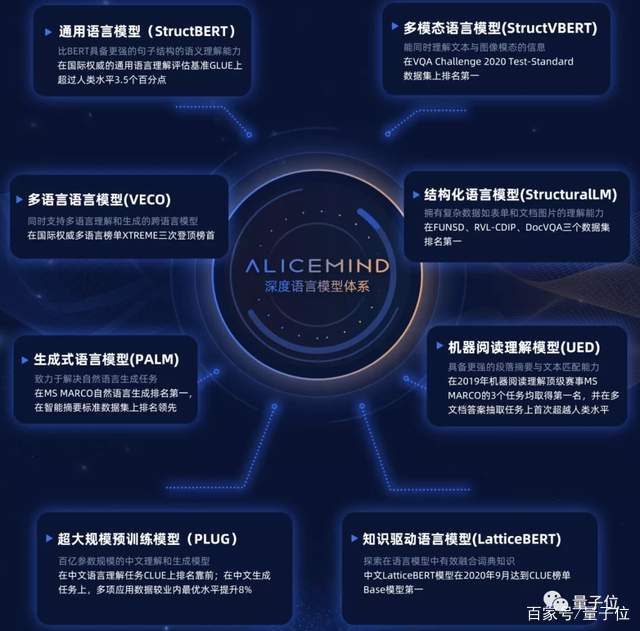 这也是她所在的达摩院深度语言模型团队的思路,他们打造的AliceMind八大模型先后登顶了GLUE、CLUE、XTREME、VQA Challenge、DocVQA、MS MARCO六大NLP权威榜单。