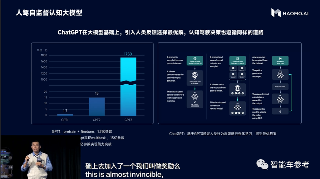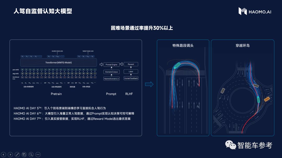 稍微解释一下,毫末的自动驾驶认知大模型采用的是RLHF(人类反馈强化技术)算法,通过不断输入真实人驾接管数据,持续优化自动驾驶决策模型。