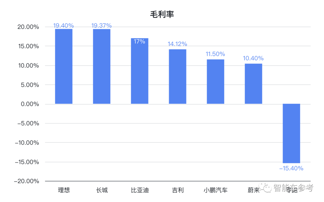 新势力中的其他几家,小鹏和蔚来毛利率均超过10%。零跑由于毛利未转正,因此毛利率也为负,为-15.40%。