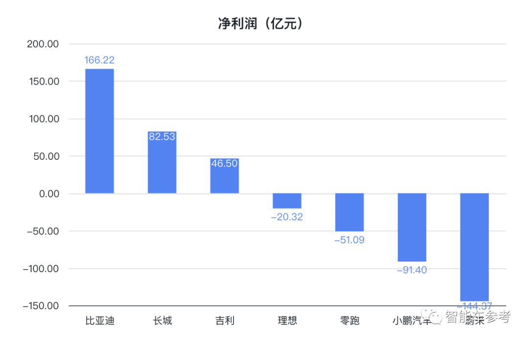 但新势力的净利润均未转正。其中蔚来亏得最多,净亏损144.07亿,小鹏次之,净亏损91.4亿。