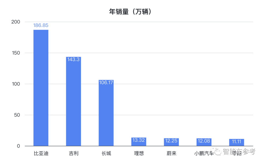 比亚迪以186.65万辆的销量排名第一,吉利、长城分别以143.3万、106.17万辆位居第二和第三。