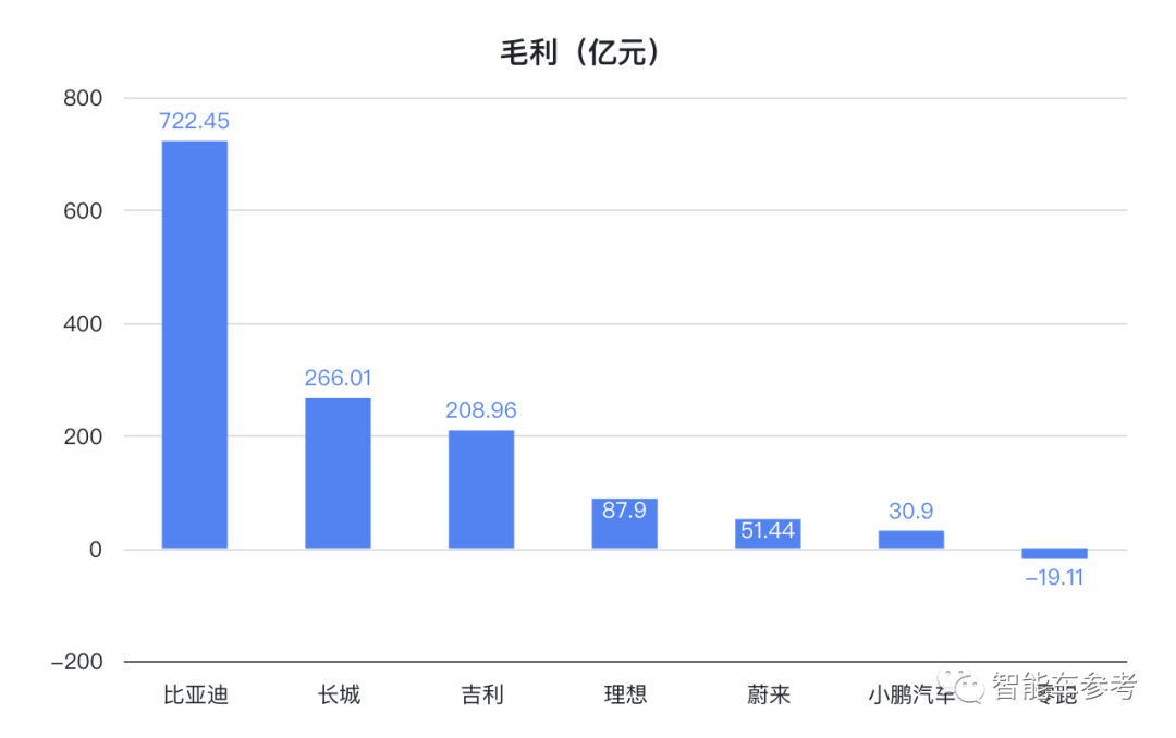 从毛利润来看,比亚迪继续稳坐第一的位置。并且,722.45亿元的毛利润仍然大于后六家总和。