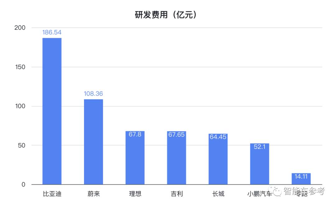其他几家,理想、吉利、长城和小鹏的研发费用都在60亿左右,零跑最少,研发费用为14.11亿元。