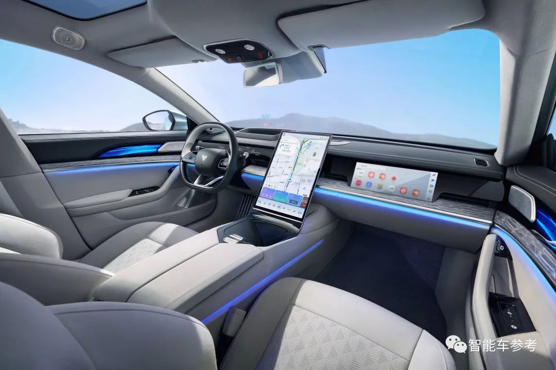 车内中控一块(巨大的)17.6英寸超薄中控屏,支持2.5K分辨率,搭配高通8155座舱芯片。另外副驾还有单独的娱乐屏。包括K歌、刷剧等等功能,副驾还可以投射到中控大屏上使用。